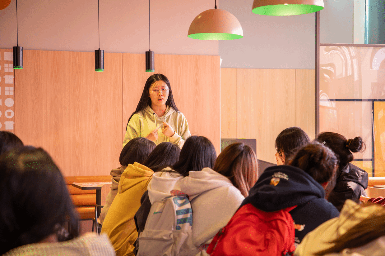 活动现场,参与麦当劳全景体验的学生,在咖啡制作区化身“咖啡师”,在餐厅后厨解锁“美食诞生密码”,在与经理的对话中明晰职业发展路径。麦当劳餐厅经理结合自身经历分享道:“麦当劳建立了标准化、透明化的人才培养体系。通过‘菁英管培生计划’,从基层运营实践起步,用2个月完成基础技能通关,随后晋升为值班主管、顾客体验经理,最终在18个月内实现了成为餐厅经理的职业目标。这一过程依靠的是‘能力+业绩’的双重驱动。”