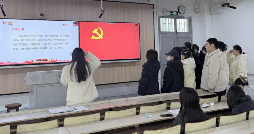 宣誓大会在庄严雄壮的《国际歌》声中正式开始,在常铖老师、张世瑞老师的带领下,全体预备党员面向鲜红党旗,高举右拳,郑重宣读入党誓词。铿锵有力的宣誓声在教室内回荡,彰显出新党员坚定不移的政治信念和为共产主义事业奋斗终身的决心。