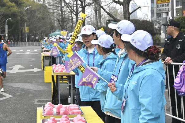 随着跑者陆续经过,志愿者们挥舞手中的加油牌,齐声呐喊助威。赛道旁,跃动的“志愿红”与沿途盛开的樱花交相辉映,成为春日江城的动人风景。志愿者们以热情周到的服务,让来自各地的跑者在奔跑中感受到武汉的城市温度。