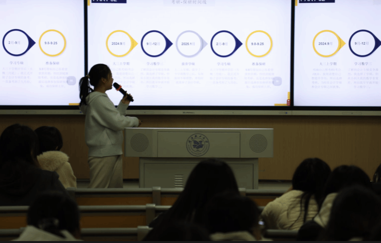 庞兼从保研政策解读、专业学习以及综合素质三个方面讲解自己的保研之路,为大家分享自己的学习方法;张静围绕“你走的每一步都算数”这一主题从学习成绩、推免要求及流程、信息获取、心态管理几个角度展开,分享自己的经历与意见;郭欣慧从考研与保研的时间线、保研要点以及独到的保研心得等方面为大家分享“保研秘籍”。